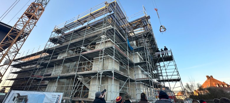 Ebenfalls ist der Innenbereich des Gebäudes fast vollständig entkernt, das Bestandstreppenhaus entfernt, der bisherige Dachstuhl wurde abgerissen und eine Brettstapeldecke aufgesetzt. Parallel dazu wurden in den entkernten Geschossen bereits die Fenster eingebaut. Kürzlich wurde der neue Dachstuhl aufgesetzt, deshalb war es an der Zeit, das Richtfest zu feiern.