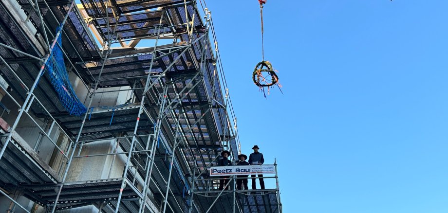 Bürgermeister Abraham bedankte sich beim Richtfest auch bei den Schülern, den Lehrern und den Elternvertretern der Schulen: Während der Bauarbeiten gab es bislang keine Beschwerden über etwaige Behinderungen des Schulbetriebs, obwohl der Baubetrieb unmittelbar neben der Schule stattfindet. Das Verständnis für die Erfordernisse des Baustellenbetriebs und manche Ablenkung durch interessierte Schülerblicke aus den Fenstern verdient unseren höchsten Respekt.