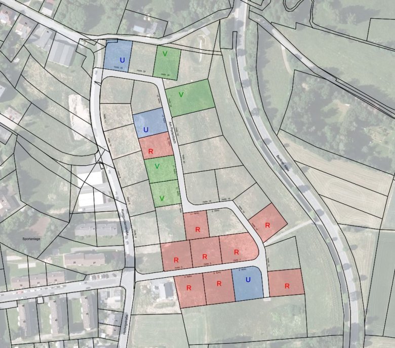 In der folgenden Übersicht sind verkaufte (V), reservierte (R) und unverkäufliche (U) Bauplätze dargestellt (Stand 25.11.2025):